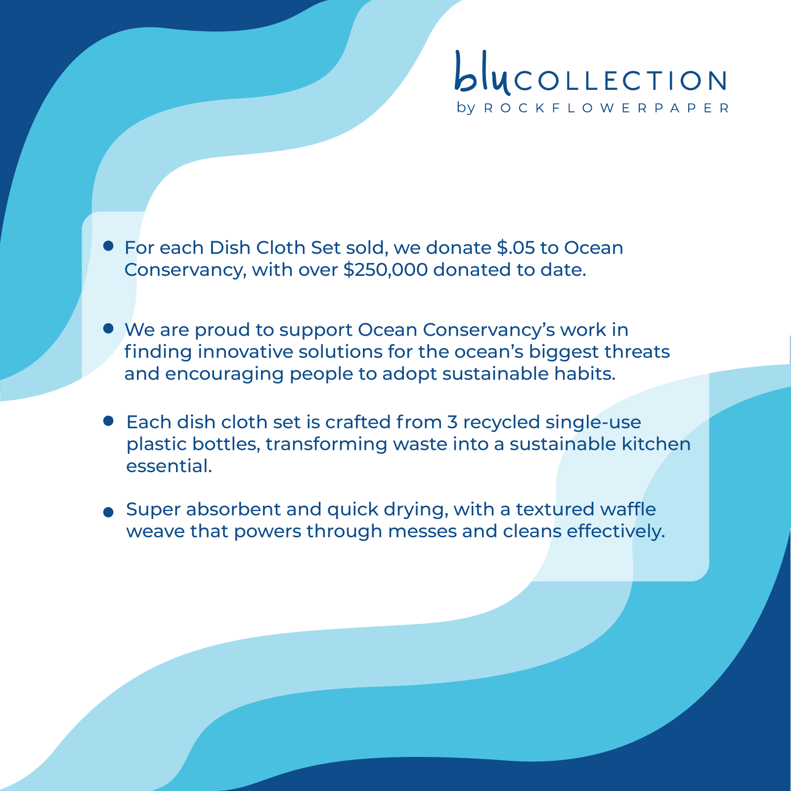 Part of our sustainable Blu Collection benefiting Ocean Conservancy. We donate 5 cents for every Dish Cloth set sold.