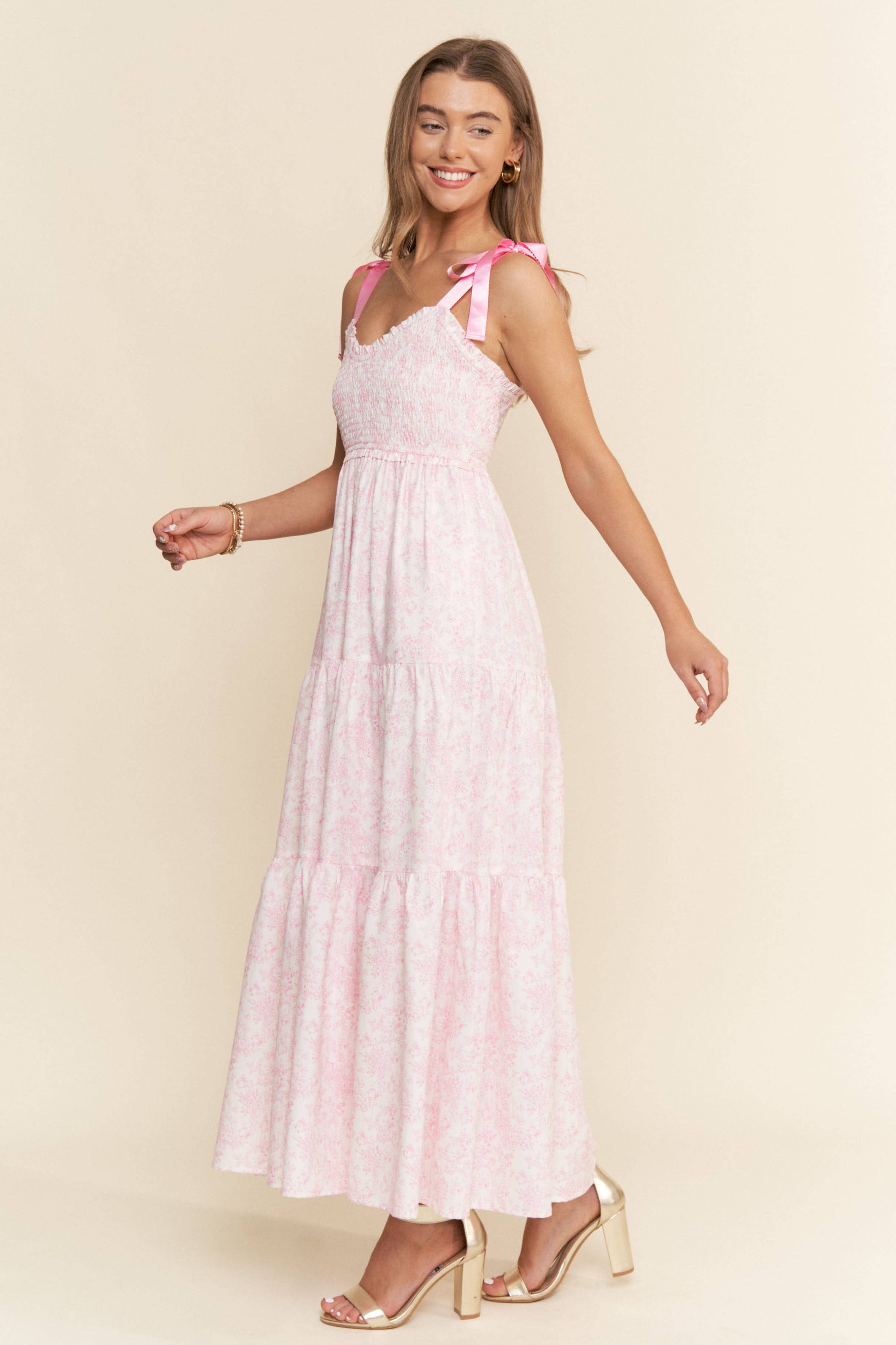 Women's empire neckline smocked floral print tiered maxi dress with pockets. Satin spaghetti straps.