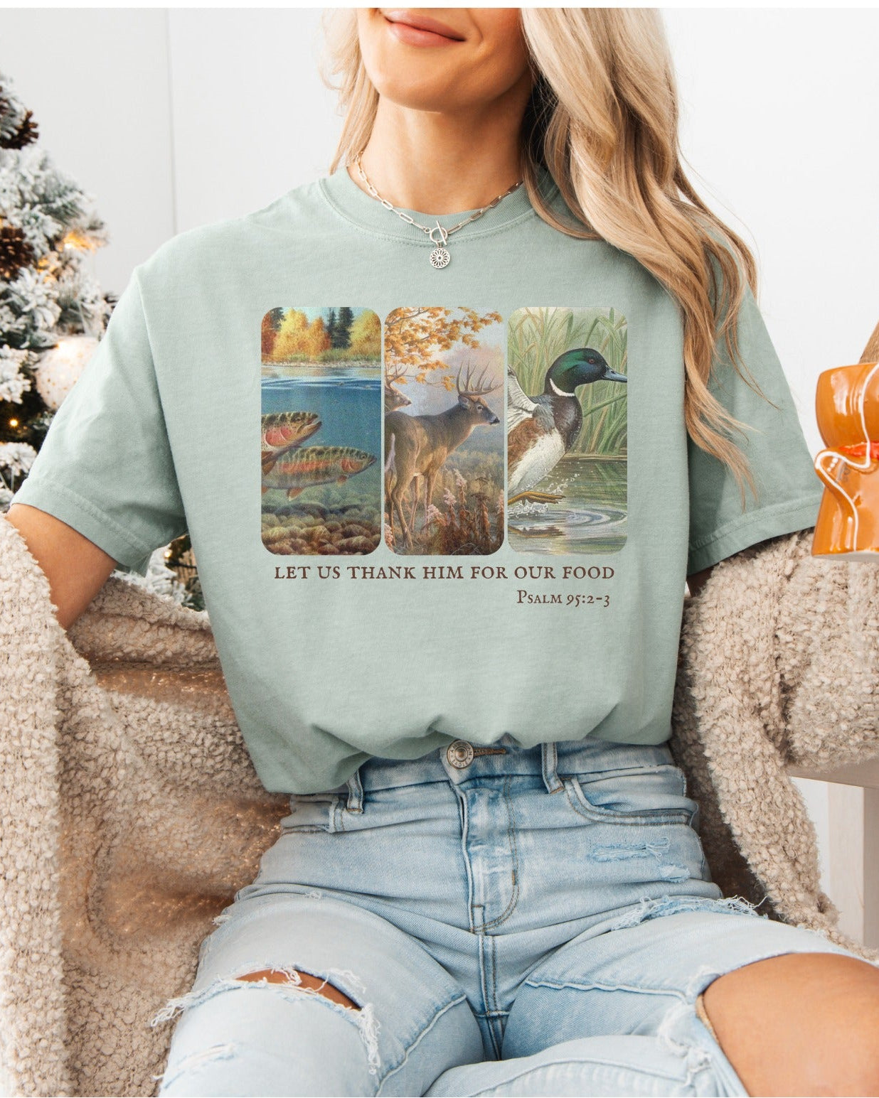 A Southern favorite for the season of gratitude. Featuring serene outdoor artwork of bass, deer, and ducks, this soft sage tee reminds us of all we have to be thankful for — from the harvest to the hunt.