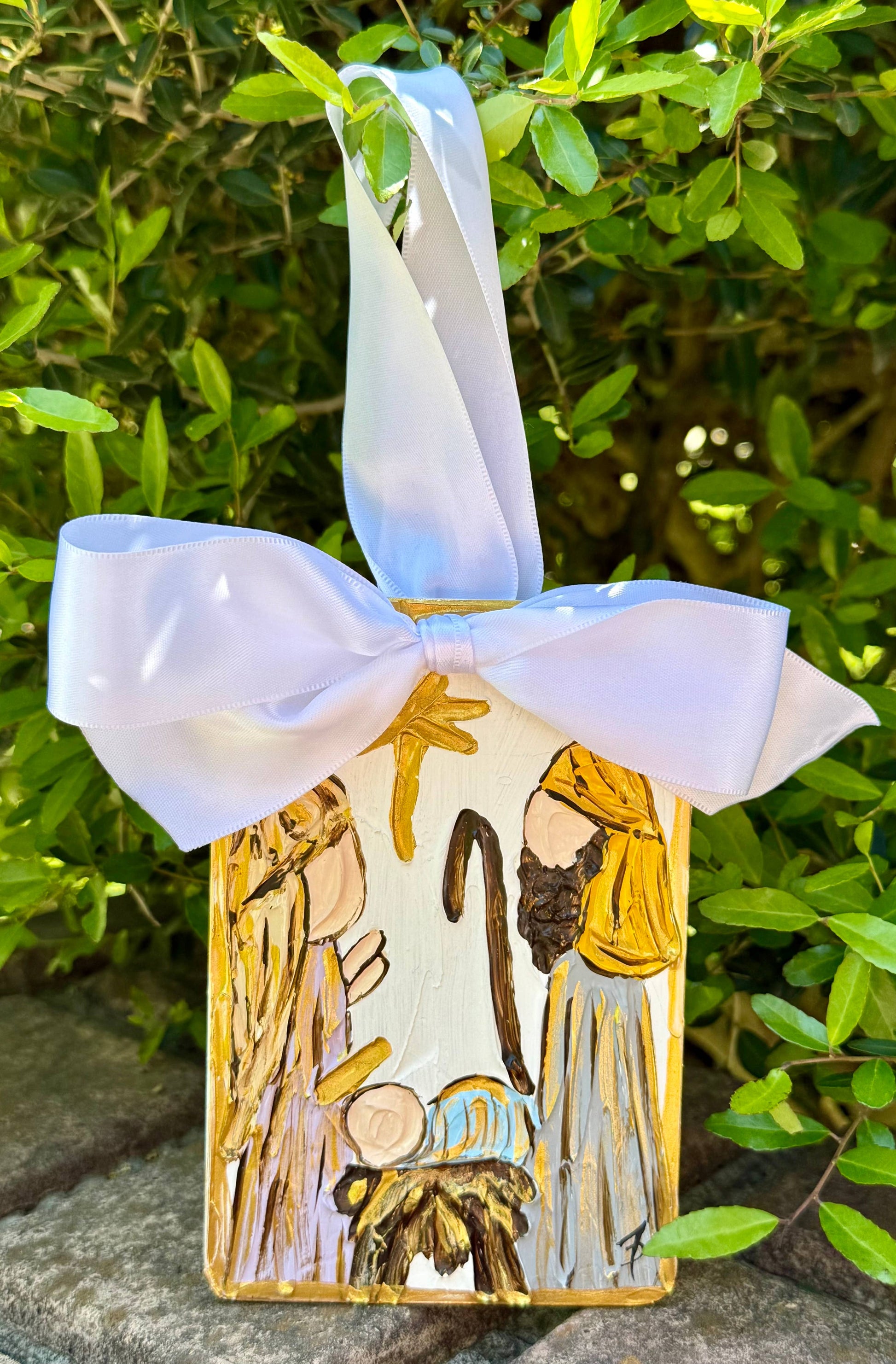 This ornament is a hand textured and painted nativity scene on thin wood base. Colors will vary but all are highlighted with metallic gold paint. A 1 1/2 inch satin bow is added to each ornament for hanging on the tree.