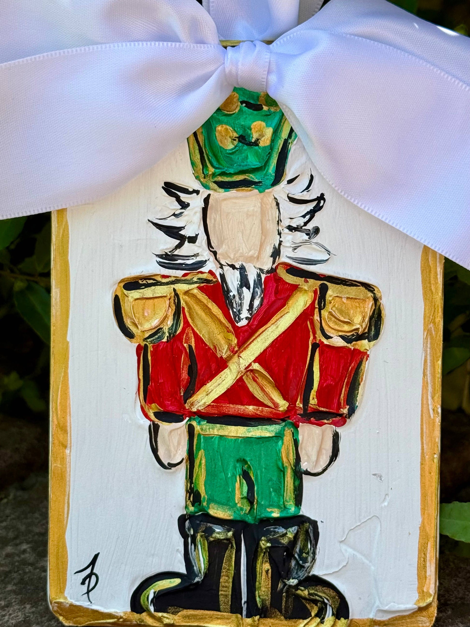 These hand textured and hand painted nutcracker ornaments will make a great addition to any tree. Ornament size: 4”x6”. Each ornament is an original work of art (not a transfer or printed on) making no two exactly alike. Chose from 4 different color combinations. A 1 1/2” double faced satin ribbon is added for easy hanging on the tree.