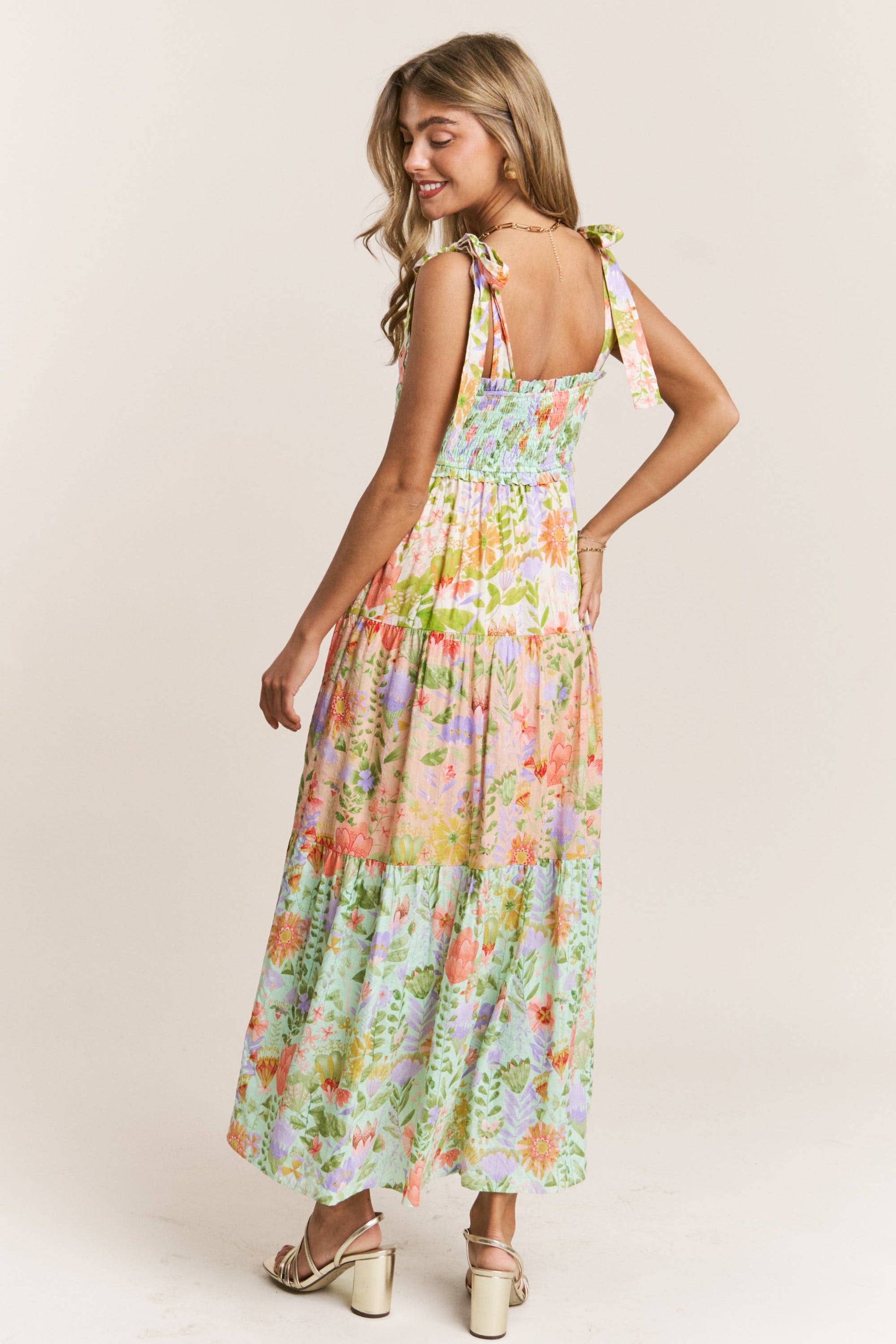 Smocked V-neck Tiered Multi Print Dress: Garden Dream / M