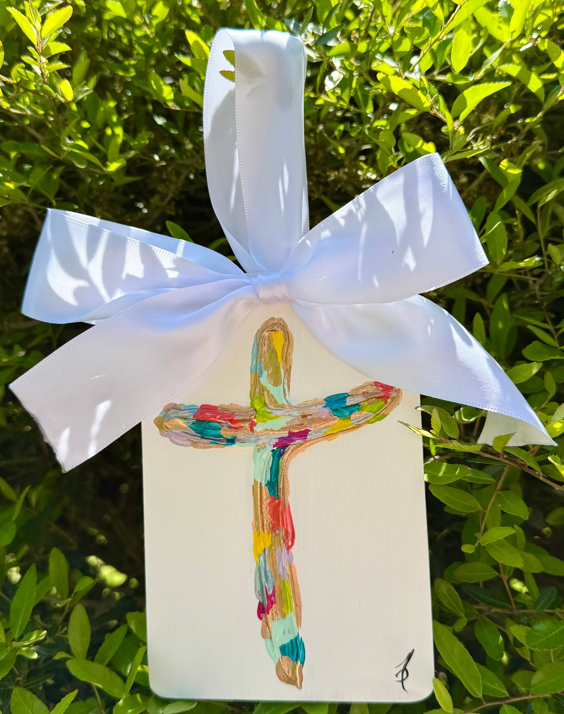 Each ornament has a hand textured cross on painted white background. Ornament size: 4”x6”. Choose between multicolored cross with gold leaf paint highlights or gold cross. A 1 1/2” double faced satin ribbon has been added for easy hanging on the tree. These ornaments also look great displayed on a small tabletop easel.